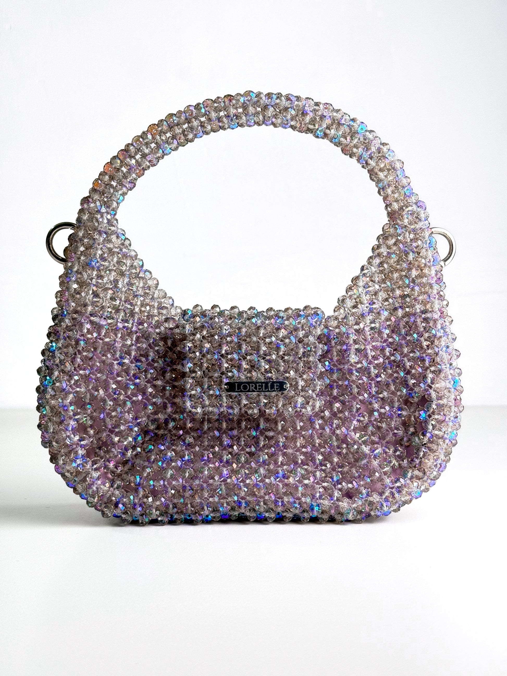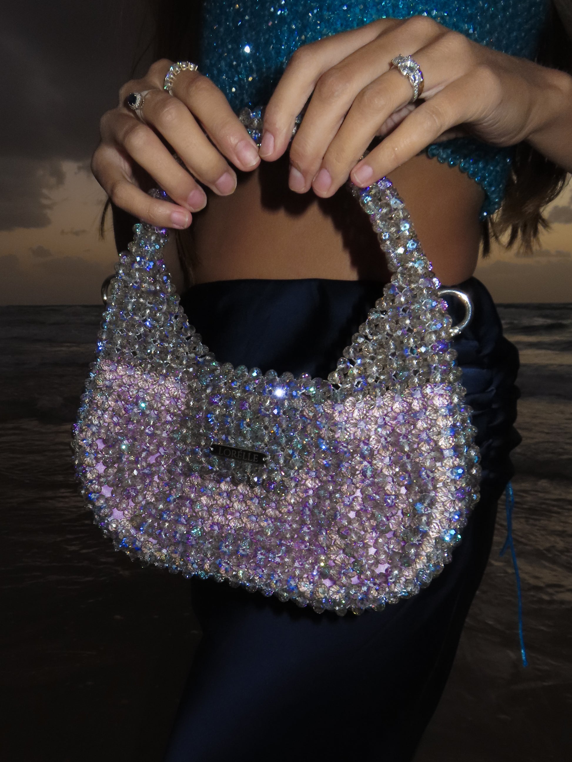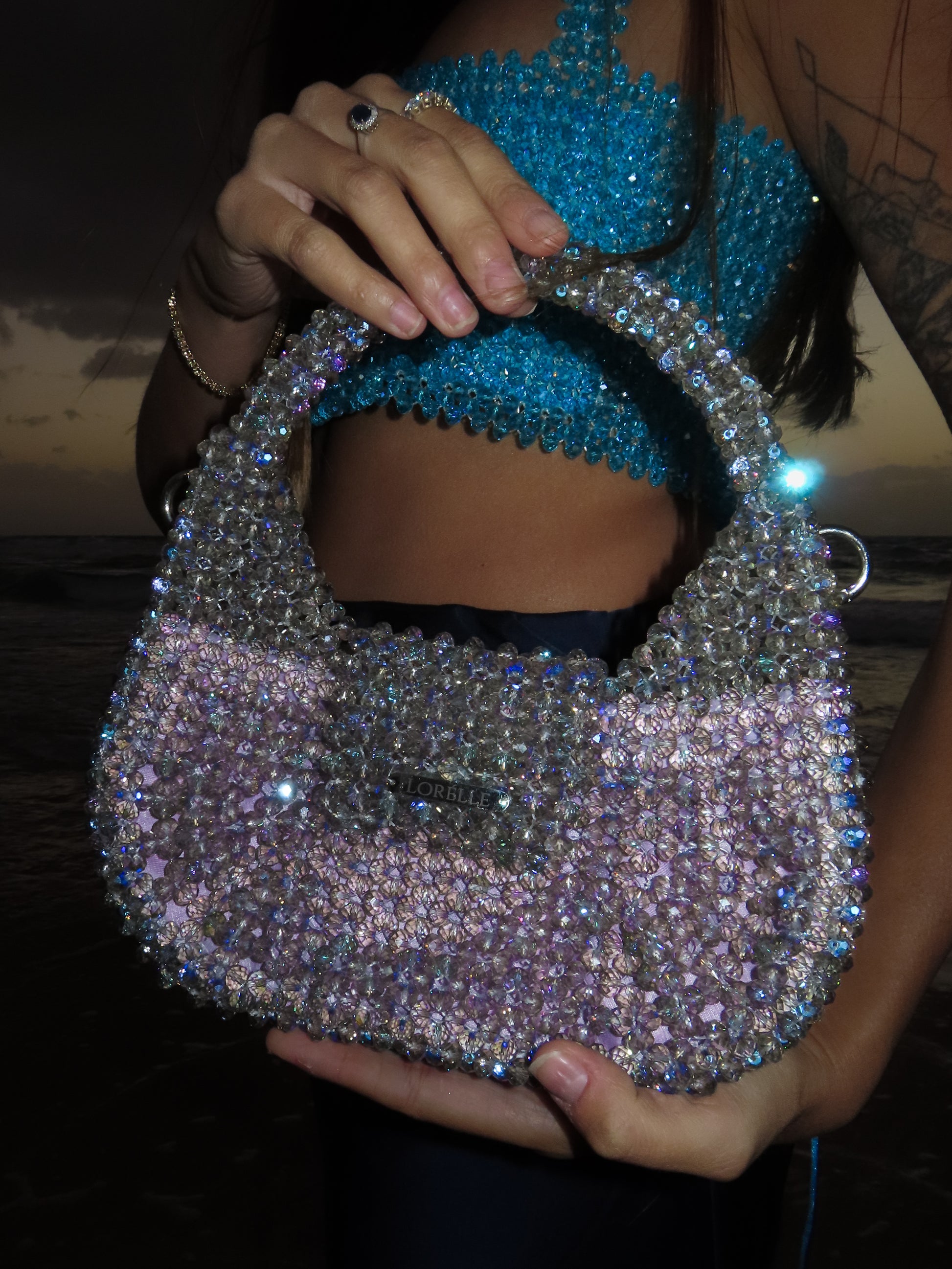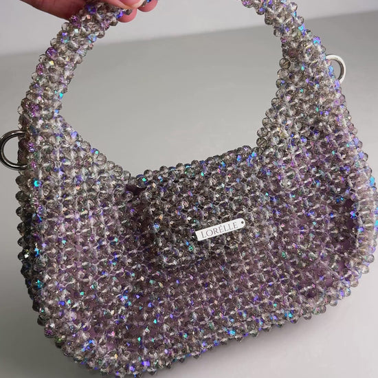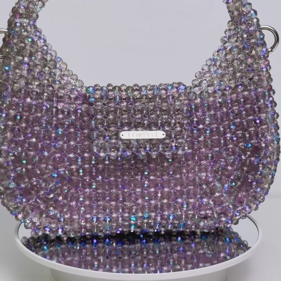 Introducing MELODY – the crown jewel of the Mermaid Collection. Shaped like an ethereal sea-born lyre harp, this sculptural masterpiece is inspired by the mystical rhythm of the ocean. Handwoven with Preciosa premium crystal beads in a shimmering purple hue kissed by ocean tones, MELODY captures the enchantment of deep-sea treasures. Each bead reflects light like sunlight dancing on waves, evoking the feeling of holding a sacred artifact from Atlantis itself. More than a handbag – MELODY is a lyrical expression of elegance, rarity, and underwater fantasy. A true statement of refinement, rarity, and rhythm – this is the premium icon of the collection.
